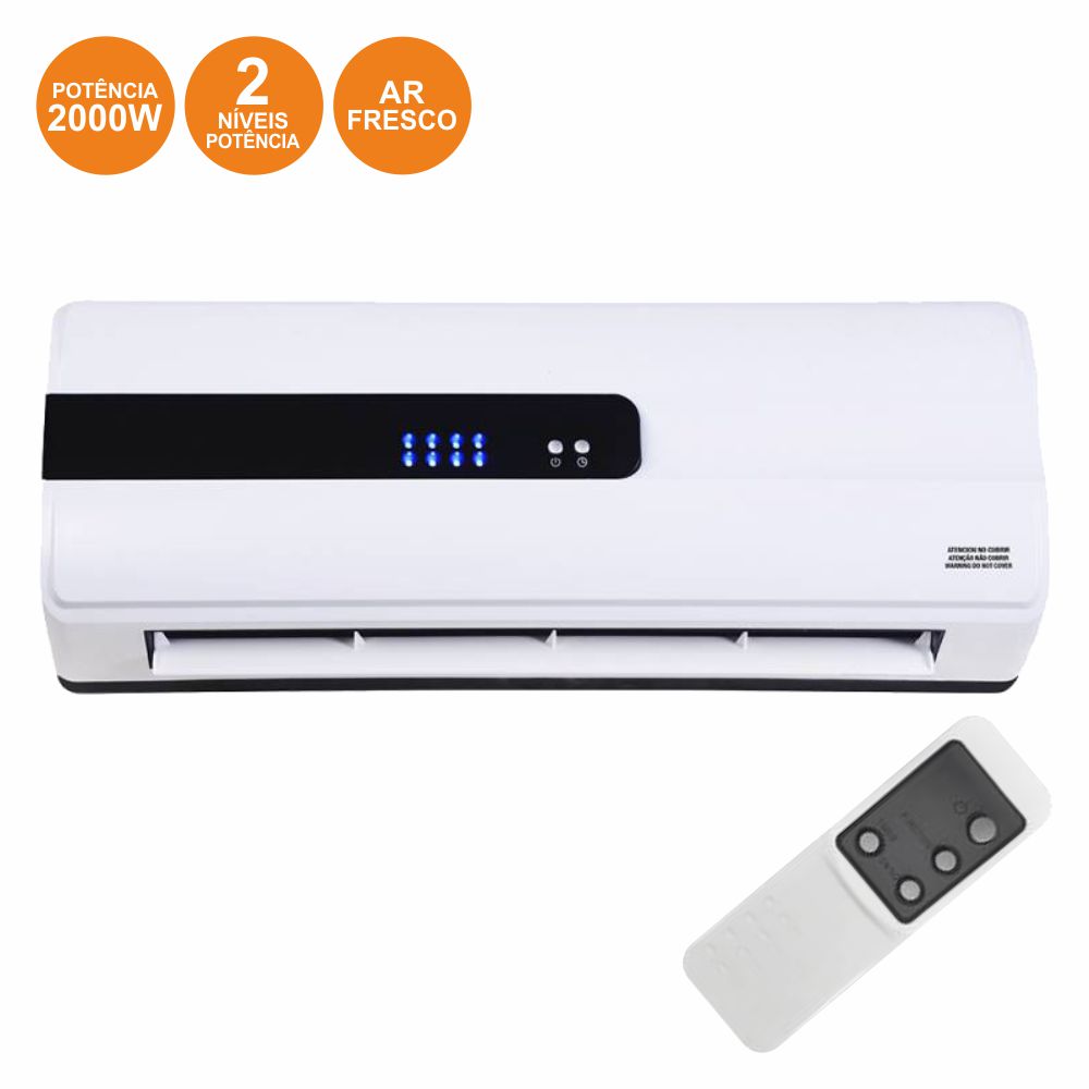 - Aquecedor de parede c/ comando - Fixação à parede c/ kit montagem - 2 Níveis potência: 1000W e 2000W - Termostato de temperatura regulável - Posição ar fresco, função anticongelante - Tensão: 230Vac, 620x205x120mm