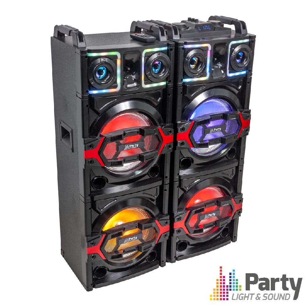 - Sistema de som Bluetooth 850W - Entradas AUX / USB / SD / BT - 2x Entradas de microfone - Efeitos luz LED colunas - Inclui carregador, controlo remoto, alça transporte - Dimensão: 2 x (280 x 355 x 1000mm)