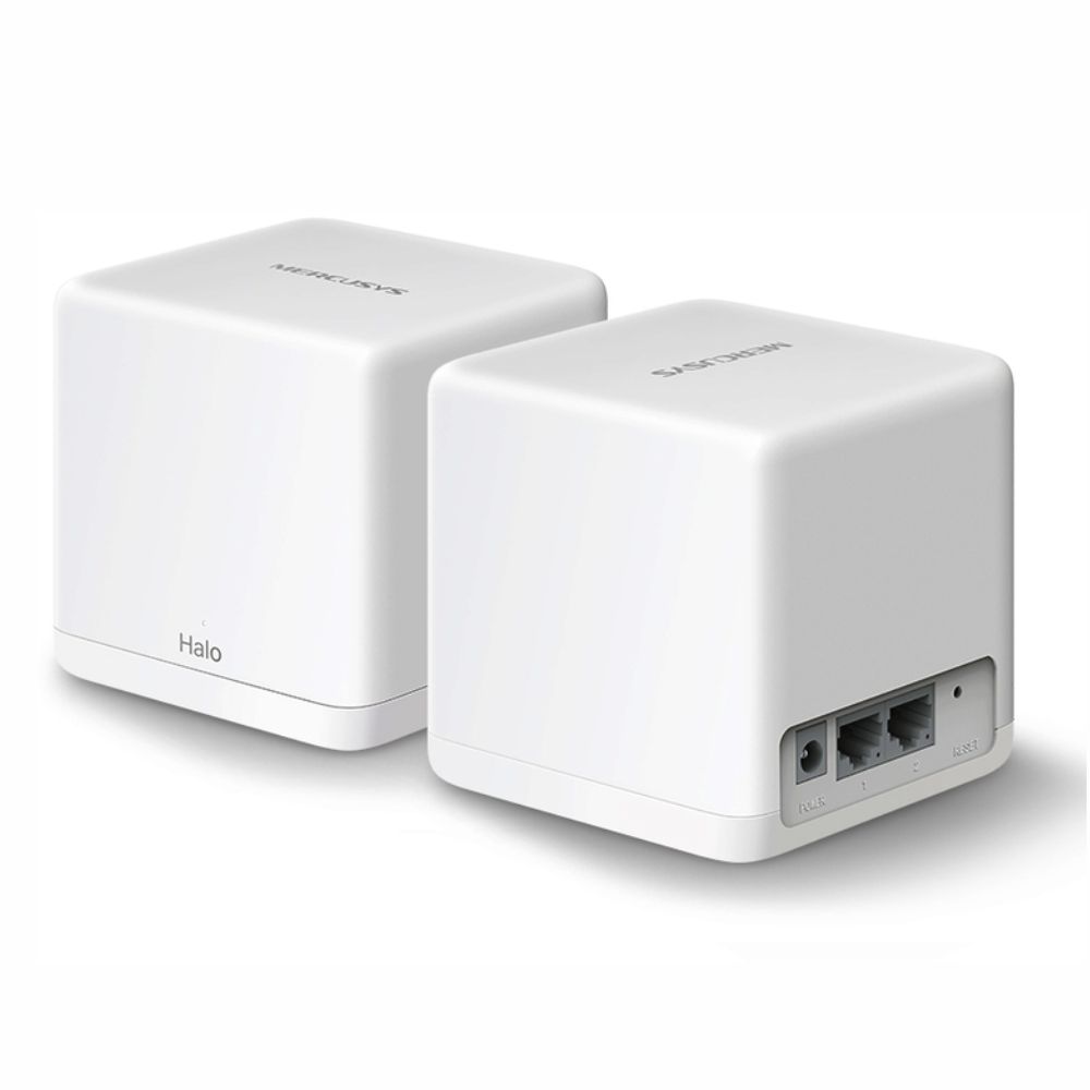 - Sistema WiFi Mesh 2 unidades HaloH30G - Normas: IEEE 802.11b/g/n - WiFi dual band 2.4 e 5GHz, até 1300Mbps - 1 Porta LAN e 1 Porta WAN (cada unidade) - Cobertura até 260m², Cabo Ethernet RJ45 incluído - APP móvel: MERCUSYS