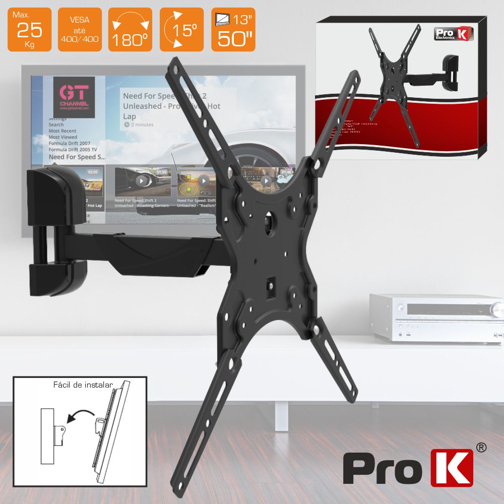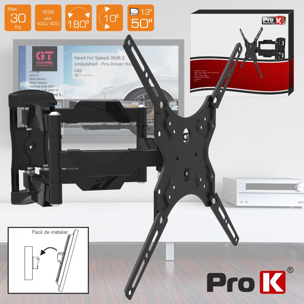 - Suporte p/ LCD e LED de 13" a 50" c/ 2 Braços - Estrutura metálica Preta, inclui kit instalação - Capacidade carga: 30Kg, VESA até 400x400 - Rotação horiz.: +180º, inclinação vertic.: 10º - Afastamento à parede: 51-388mm - Sistema p/ passagem dos cabos