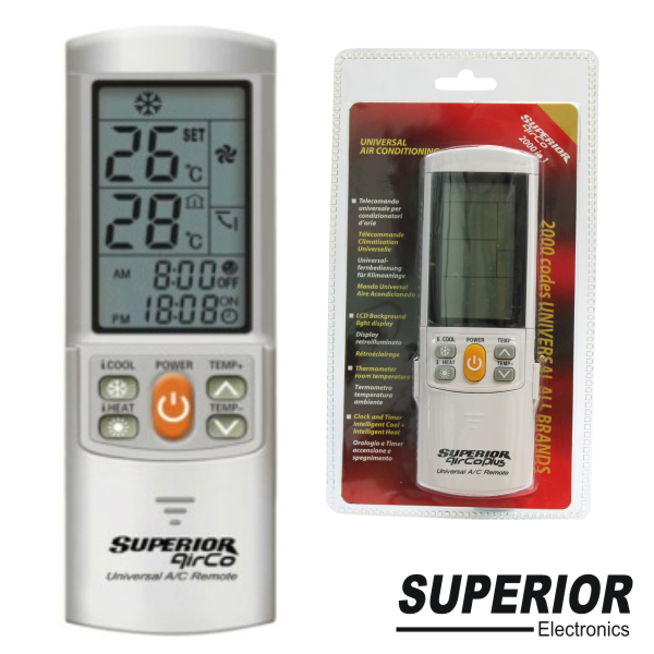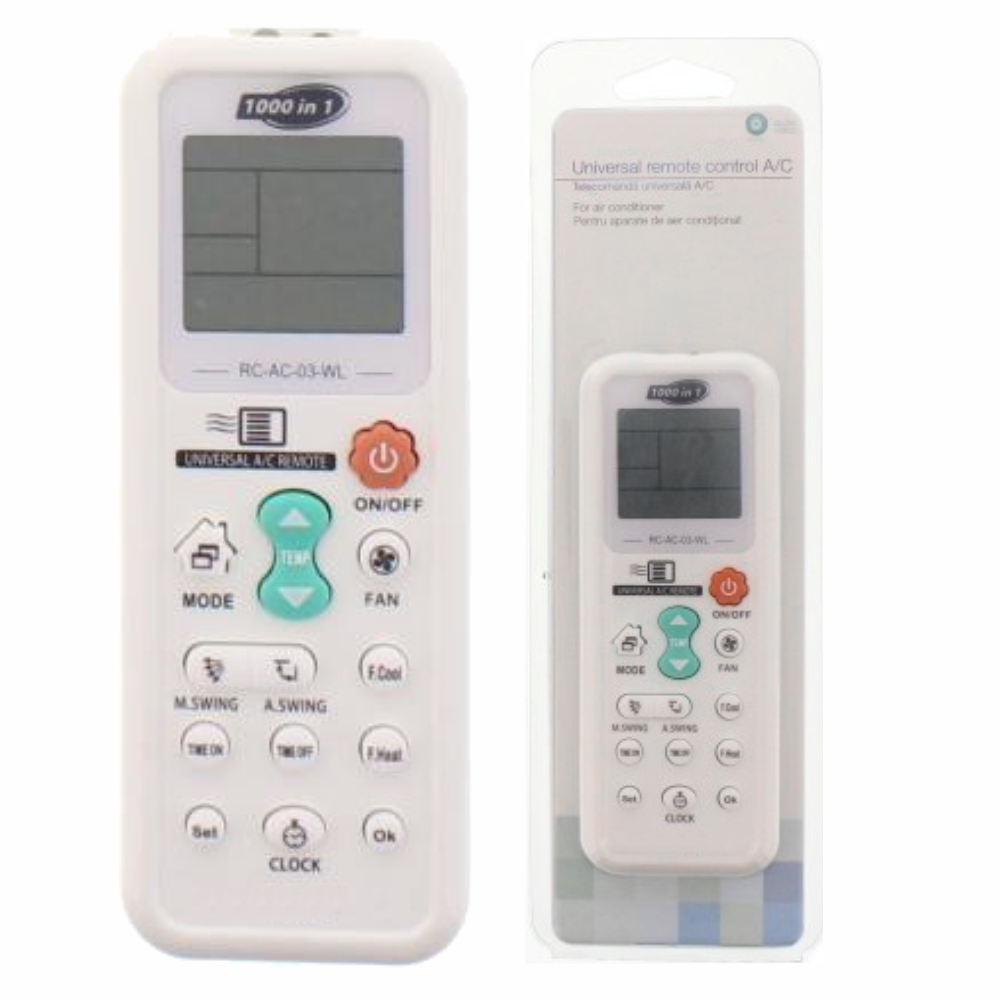 - Telecomando universal p/ ar condicionado - Abrange até 1000 marcas, comando ultra fino - Visor LCD, baixo consumo, pesquisa automática de código e manual c/ lista de códigos - Distância de transmissão até 8 Metros - Alimentação: 2x AAA (não inc.)