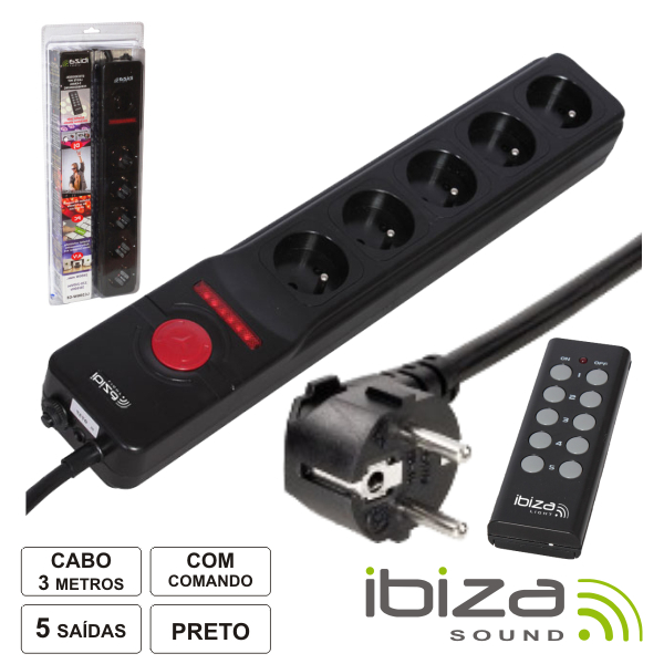 - Tomada eléctrica c/ 5 saídas e Comando - Tensão funcionamento: 220-250Vac - Potência: 2400W, tomada c/ protecção - Comprimento do cabo: 3 Metros - Comando remoto s/ fios que permite ligar e des- ligar as tomadas de saída individualmente