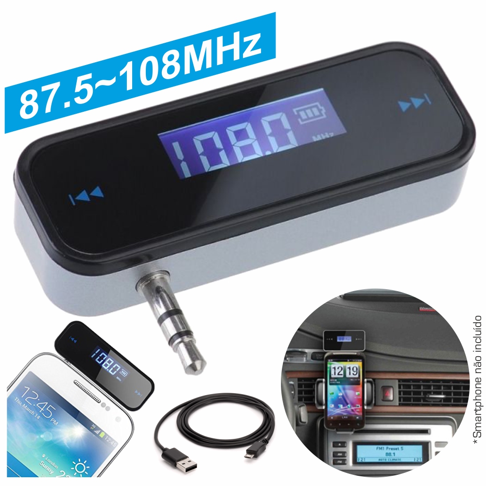 - Transmissor FM c/ ficha Jack 3.5mm - Frequência digital FM fixa: 87.5-108MHz - Bateria Lithium embutida que carrega via USB - Alcance operacional: 15-30 Metros - Compatível c/ iPhone, iPad, PC, MP3, etc - Capacidade bateria: 300mAh, cabo Micro-USB